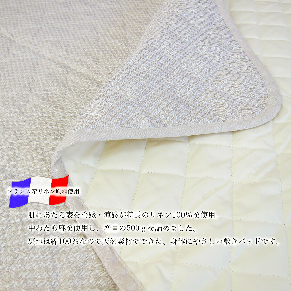 洗える本麻敷きパッド(シングル 100×205cm)[麻わた増量500g]涼感 冷感 爽やか ミニ市松 ベージュ 【 日本製 滋賀 近江 本麻敷きパット 本麻敷パット フランスリネン敷きパッド 本麻敷パッド 汗とり敷きパッドシーツ 汗取り敷きパッド BE 】